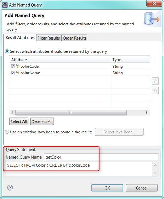 @NamedQuery (name = "getColor", query = "SELECT c FROM Color c ORDER BY c.colorCode")