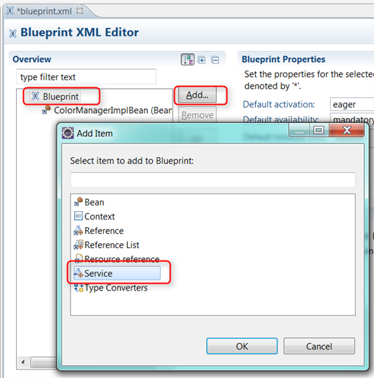 9) Create a blueprint-defined ColorManagerImpl bean and service