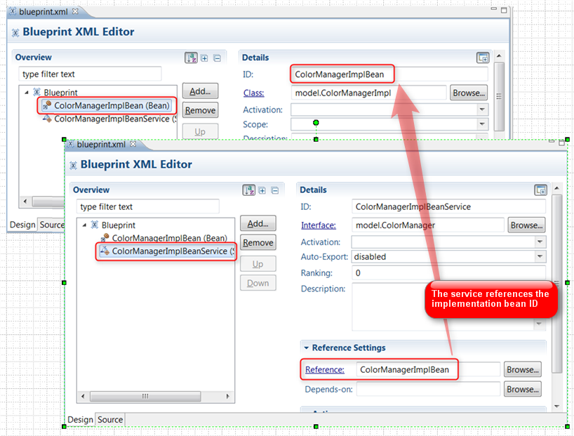 The service "reference" value is set to implementation bean's ID value